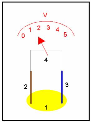 z mede a ocele slúžia ako elektródy, elektrolytom je šťava