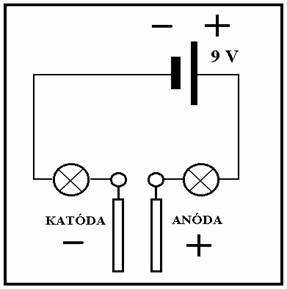 vodiče - dve elektródy (katóda je elektróda so záporným nábojom, lebo priťahuje katióny - častice s kladným nábojom)